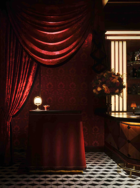 Carbone London builds on this legacy with an expansive design that elevates the brand’s signature glamour for its Mayfair setting. Designed by Ken Fulk, the restaurant channels the legendary supper clubs of 1950s New York while adding British refinement. Guests enter through a private street-level entrance into a series of lavish spaces featuring vintage-style flooring, a zinc-topped bar, and a sweeping staircase adorned with a mural celebrating New York’s golden age. The dining areas, more than three times the size of the Greenwich Village original, are layered with rich mahogany, red velvet, burgundy leather banquettes, and curated art from names such as Julian Schnabel and Ai Weiwei. Private dining rooms feature Murano chandeliers, while the patio evokes the Riviera with striped umbrellas and rattan chairs.
