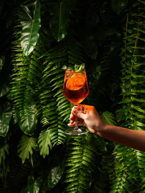 The 2,600-square-foot space captures the ambiance of an Italian villa by the sea, with cascading bougainvillea framing its entrance and interiors filled with soft drapes, candlelight, and lush greenery. White tables, deep blue banquettes, and a striking tiled bar lined with velvet high chairs set a relaxed yet elegant tone, while string lights and lanterns add a touch of Riviera romance.